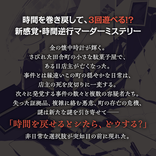 与 SNS 联动角色歌曲项目 "Clock over ORQUESTA "中的角色 "栗花飘落的栗花谋杀之谜 "一起,进入一个由能让时间倒流的神秘怀表引导的世界。